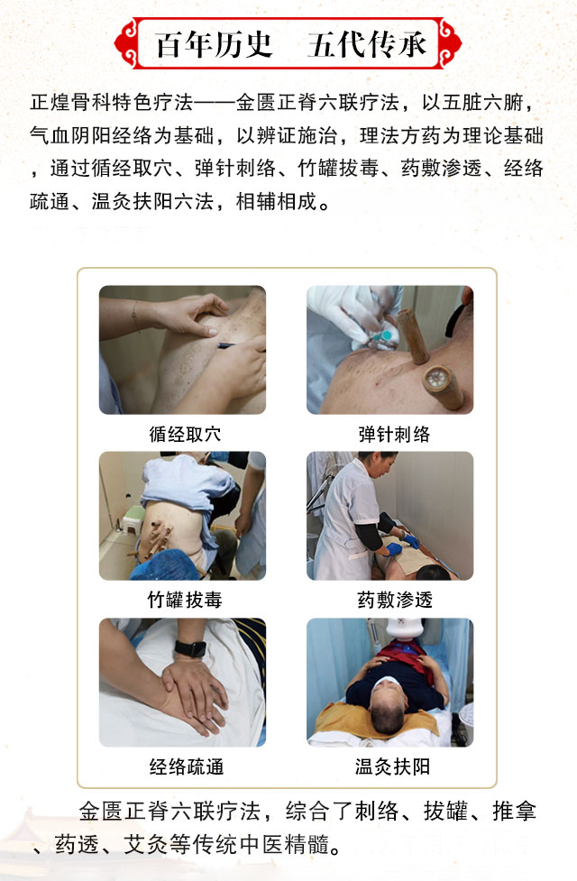 金匱正脊六聯療法源于清朝乾隆皇帝詔令太醫院院判吳謙,主編的《醫宗金鑒》中記載的藥竹筒療法,清嘉慶李鳴珂,以此為基礎,創出金匱正脊六聯療法,對治療頸肩腰膝腿痛等癥療效彰著,如今經過五代人的傳承與改進,并經臨床大量病歷驗證,此療法對治療椎管狹窄、椎間盤突出等更安全、更可靠,見效也更快。